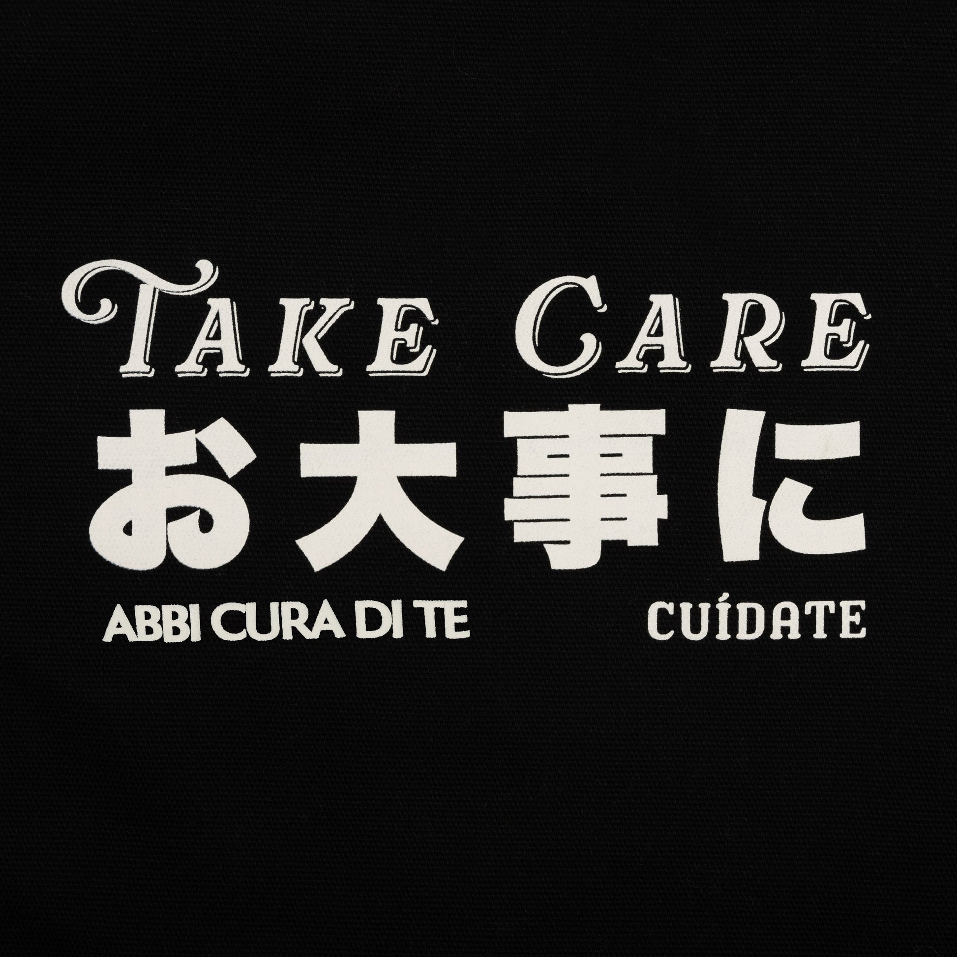Our Take Care Tote in Black serves as a kind reminder always to take care of yourself and your community—It Features puff paint TAFT on the front and "Take Care" message.