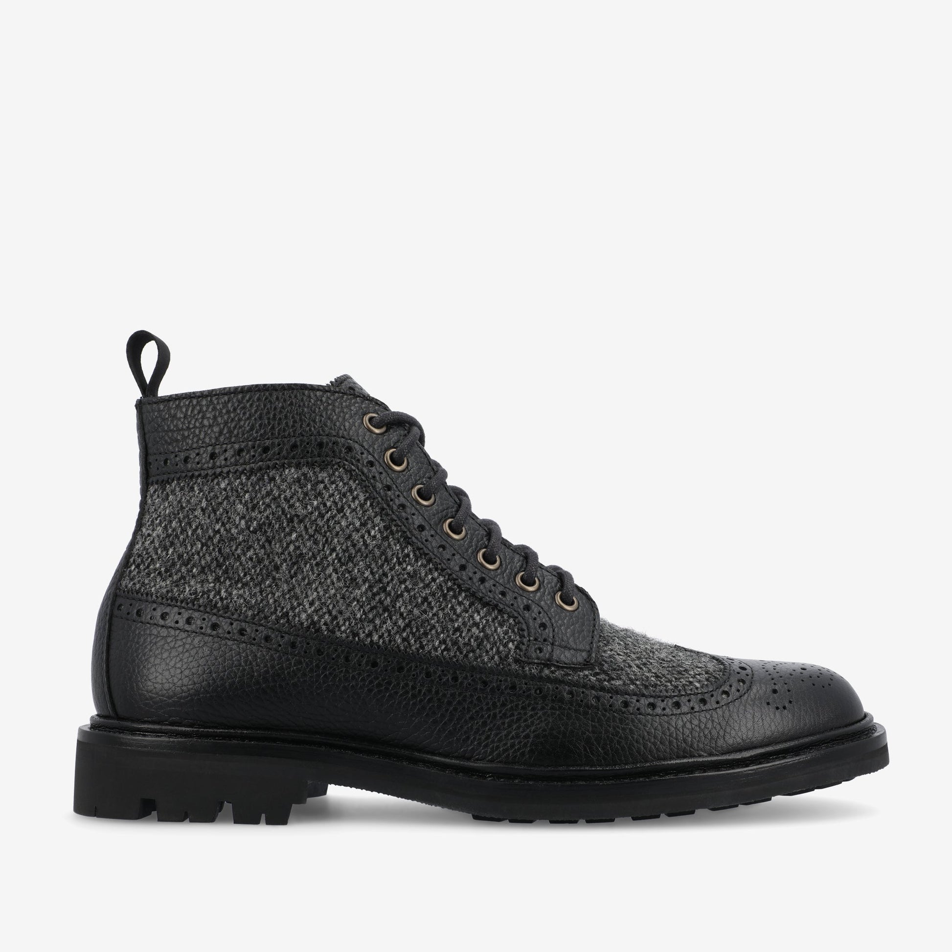 The Boston Boot in Black from TAFT captures the essence of the iconic long-wing brogue style, creating a moment of class. Featuring a full-grain leather upper complemented by Harris Tweed® sourced from Scotland, the boot fuses traditional craftsmanship with a contemporary look. Its leather-lined interior enhances comfort and style, while the rubber commando sole provides reliable traction for various terrains. The Blake-stitched construction adds to the boot's allure, making the Boston men's boot a refined choice for those seeking luxury in their urban adventures.