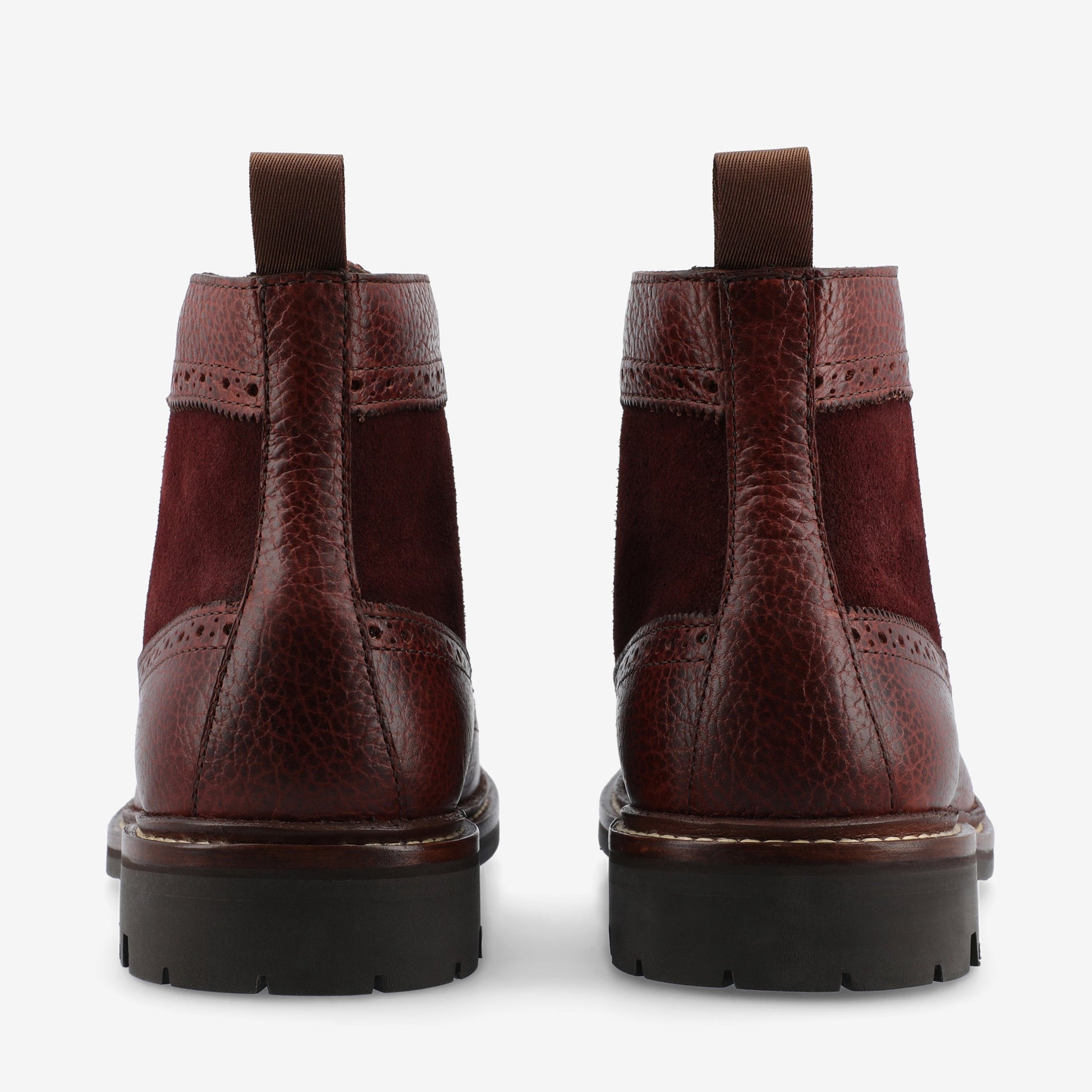 The Boston Boot in Chili from TAFT captures the essence of the iconic long-wing brogue style, creating a moment of class. Featuring a full-grain leather upper complemented by Suede, the boot fuses traditional craftsmanship with a contemporary look. Its leather-lined interior enhances comfort and style, while the rubber commando sole provides reliable traction for various terrains. The Blake-stitched construction adds to the boot's allure, making the Boston men's boot a refined choice for those seeking luxury in their urban adventures.