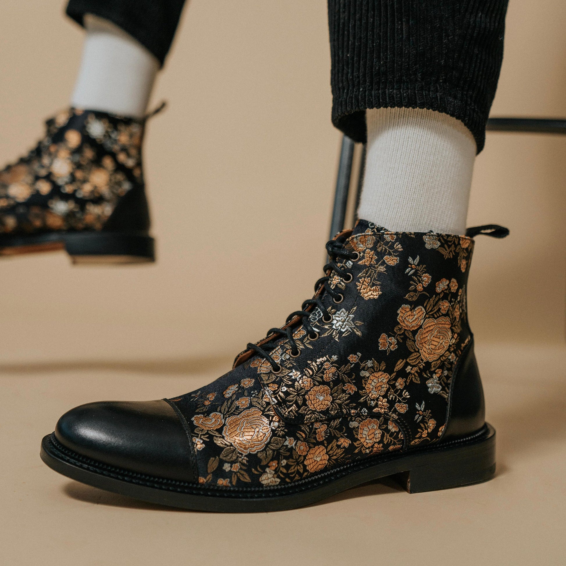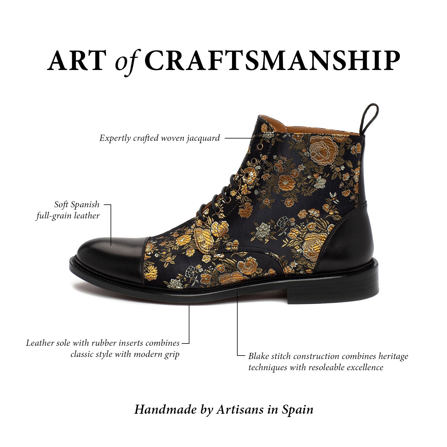 The Jack in Eden Noir men's boot features a floral jacquard weave and black leather heels with a toe cap. This men's shoe is crafted with full-grain calfskin from Italy.