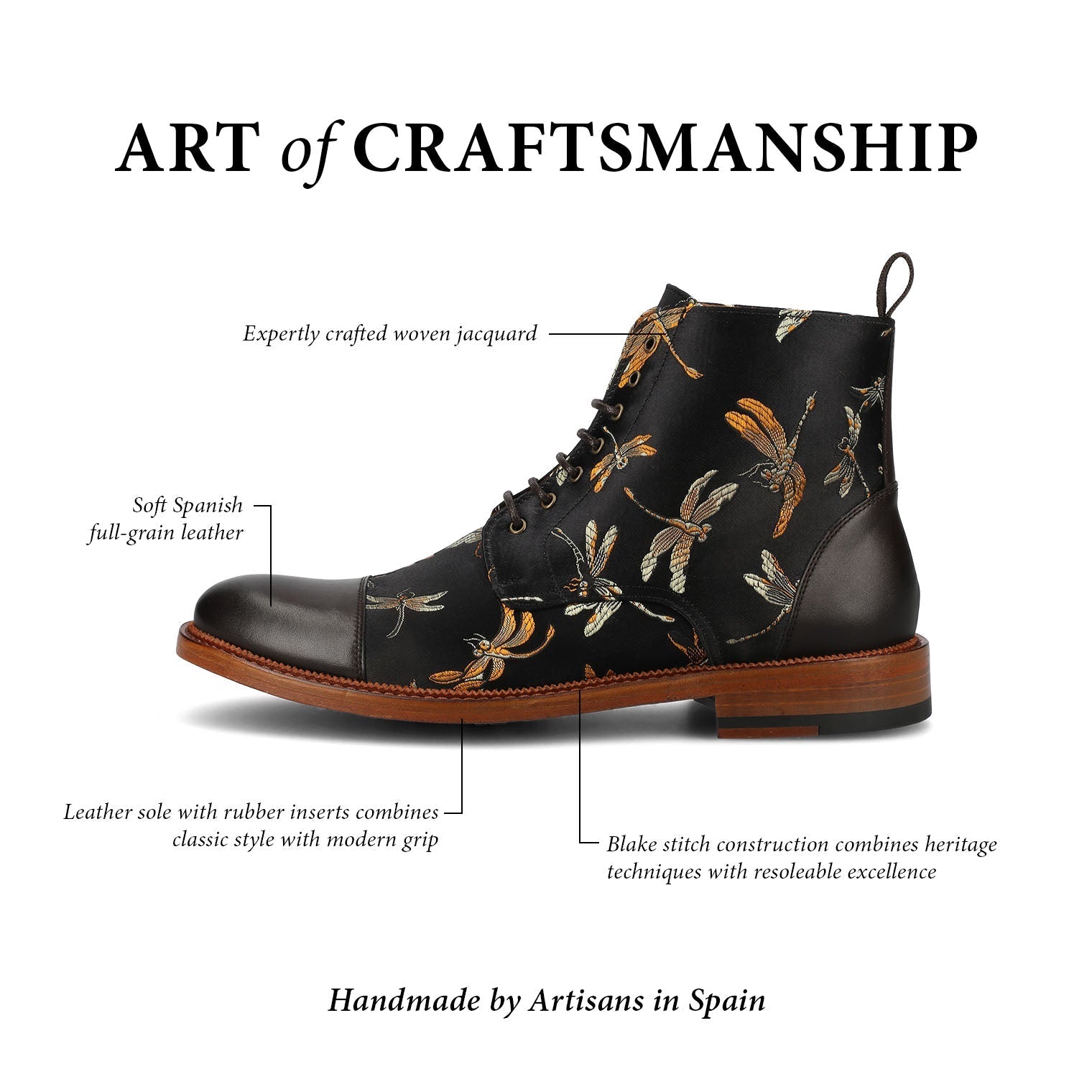 The Jack in Black Dragonfly is the ultimate boot for the bold. Feel fly with golden dragonflies against black Jacquard weave. These boots have had over 2,000 5-star reviews, and for a good reason too. Their lace-up feature makes them more reliable, comfortable, and built to last. The sole features leather with some rubber details that give it that perfect grip and durability. With how versatile they are, you can wear them to a formal event or with your casual clothing.