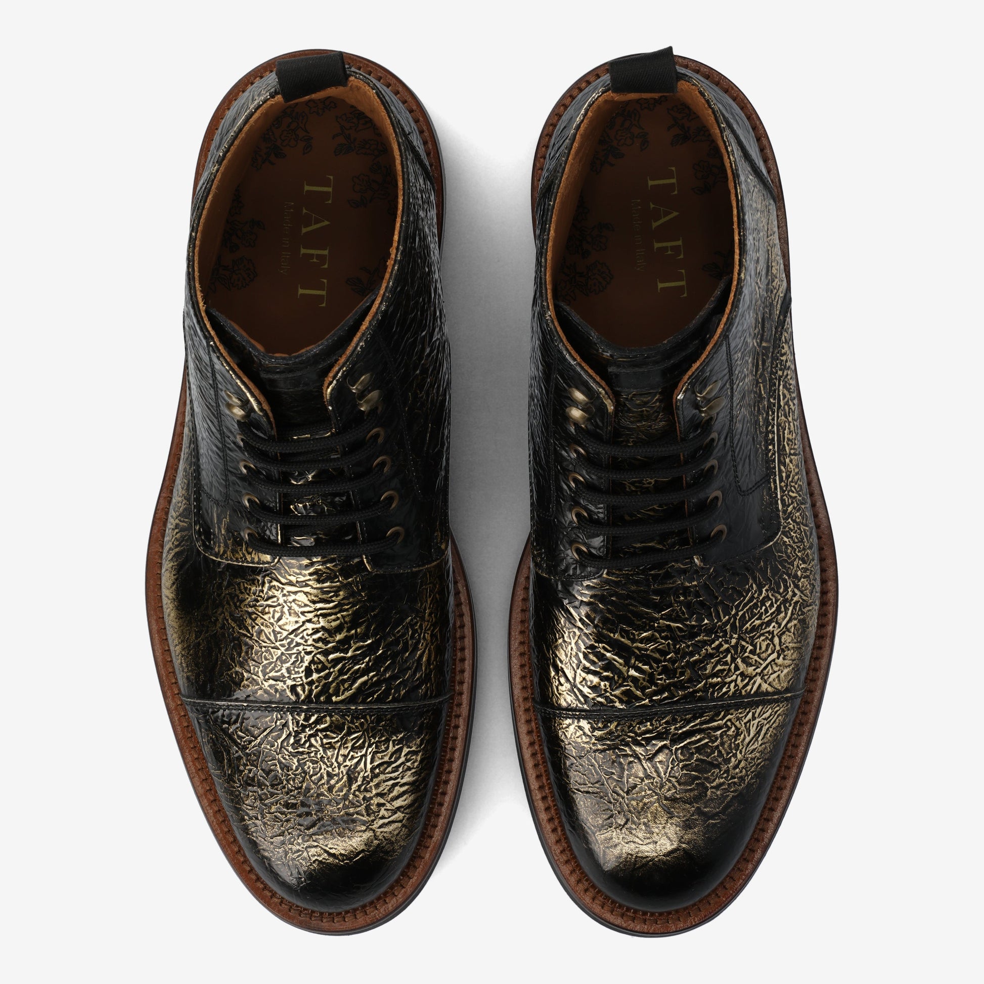 The Rome dress boot by TAFT is a bold statement piece, crafted in Italy with striking prints and designs, including croc print and floral patterns. Made from genuine leather and suede, it features a classic lace-up closure and a sleek silhouette.