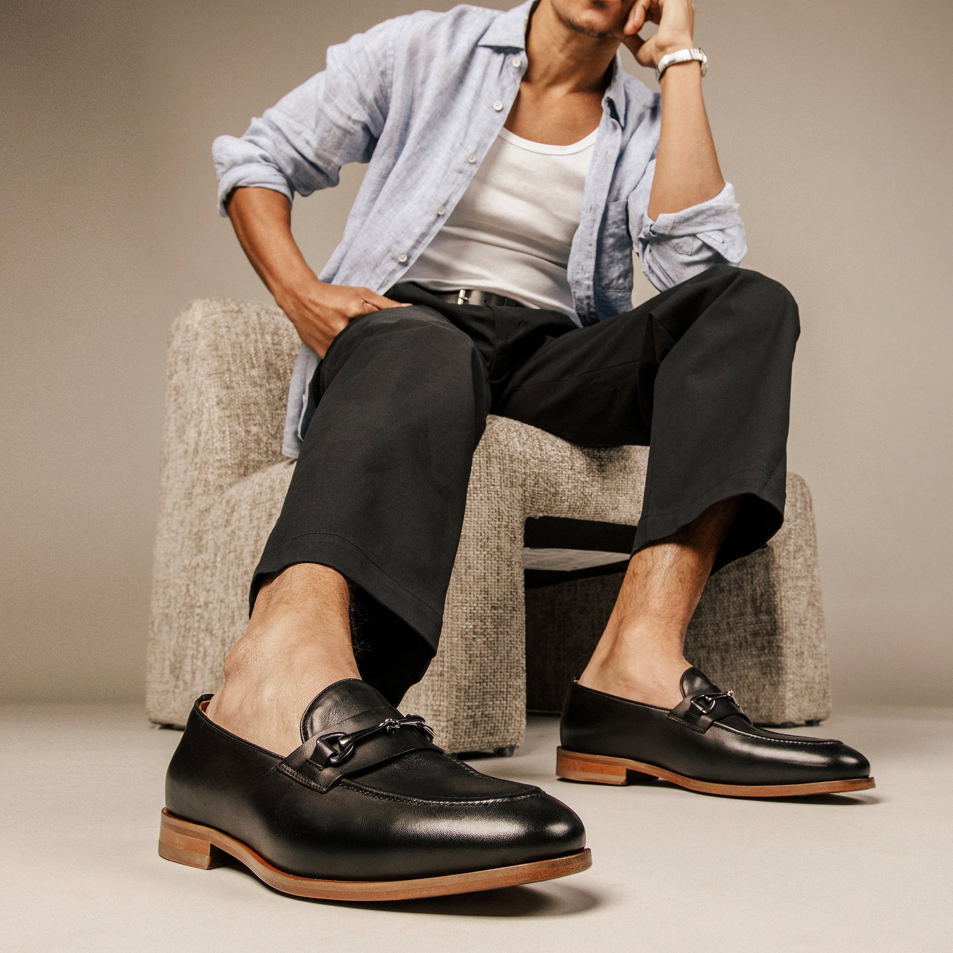 The Russell bit loafer by TAFT showcases a bold, classic style with striking hardware detail. Crafted from genuine leather, it is enhanced with elegant Jacquard accents around the ankle.