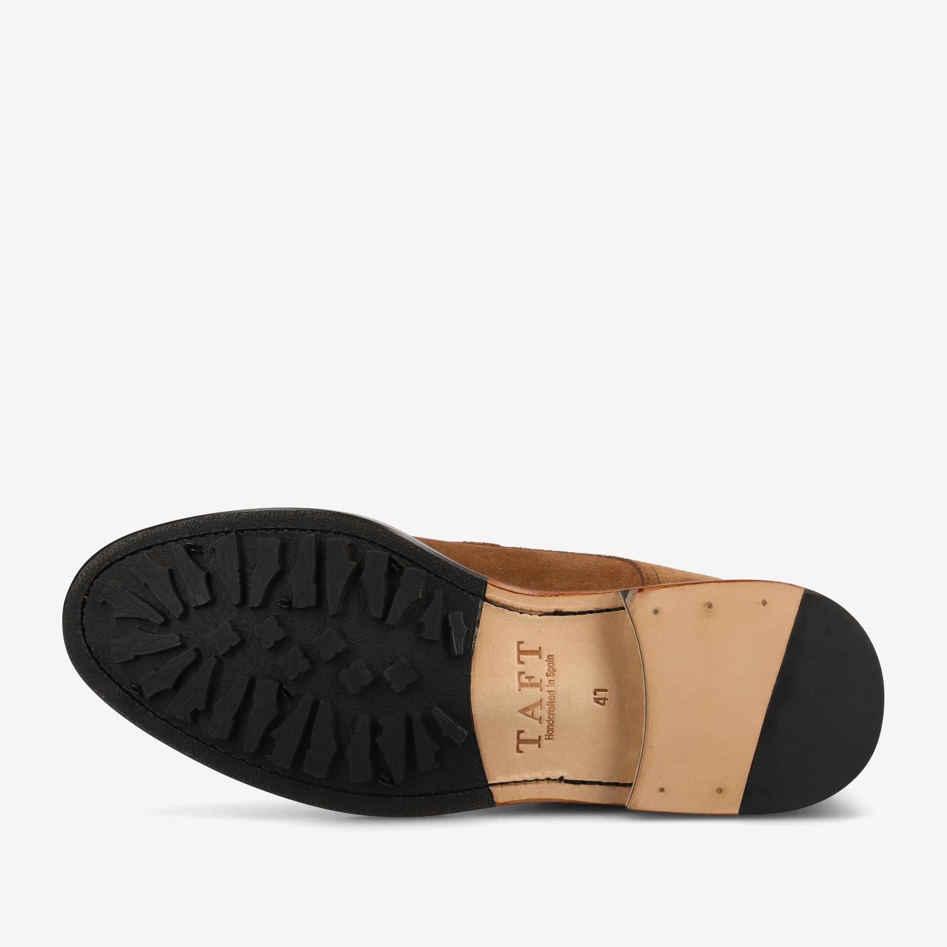 The Troy Boot in Cognac from TAFT, an OG favorite, reimagined. Crafted with premium Spanish suede, this men's boot features a Spanish full-grain calfskin toe cap and heel counter. The custom TAFT "Shoe Dog" rubber sole, is enhanced with a braided welt.
