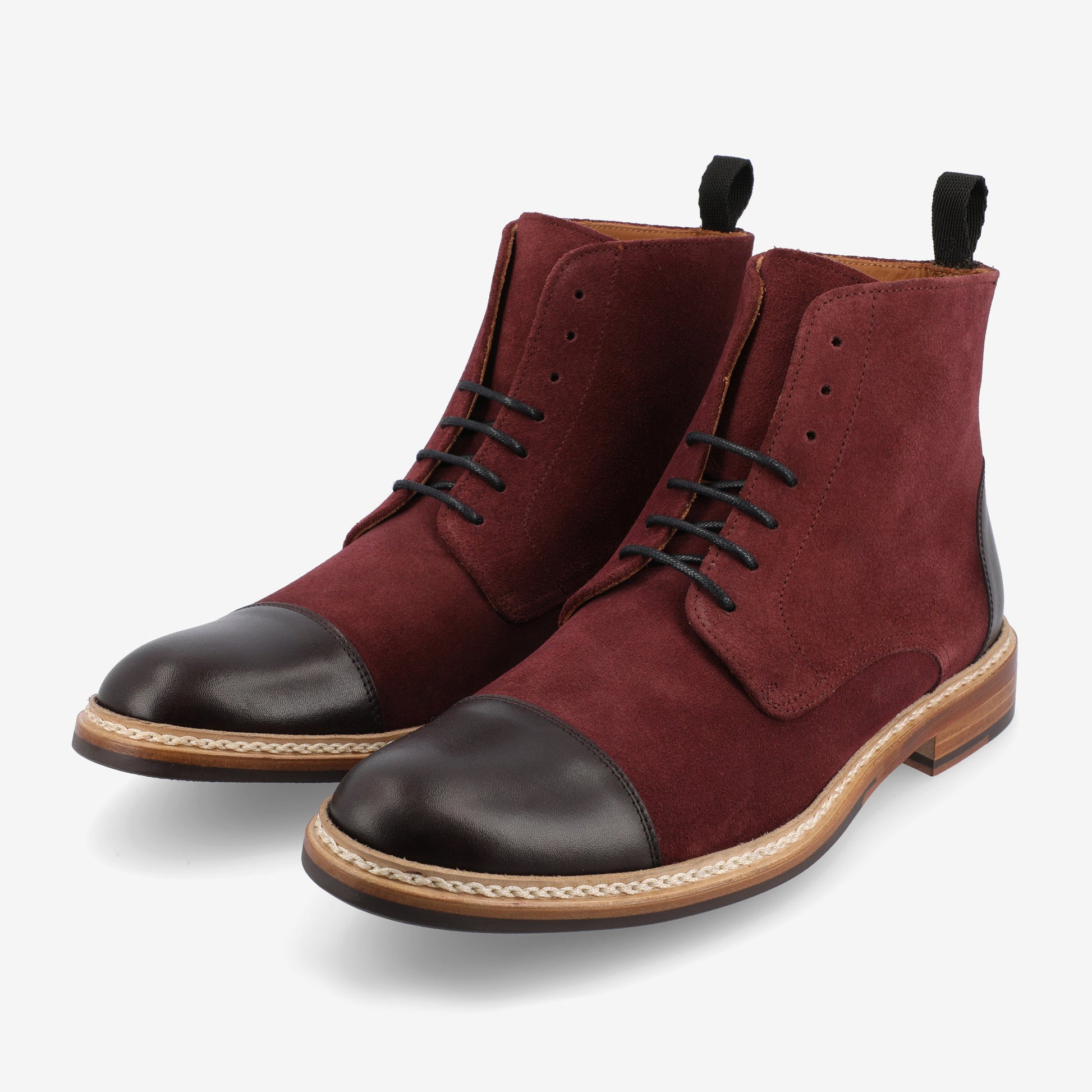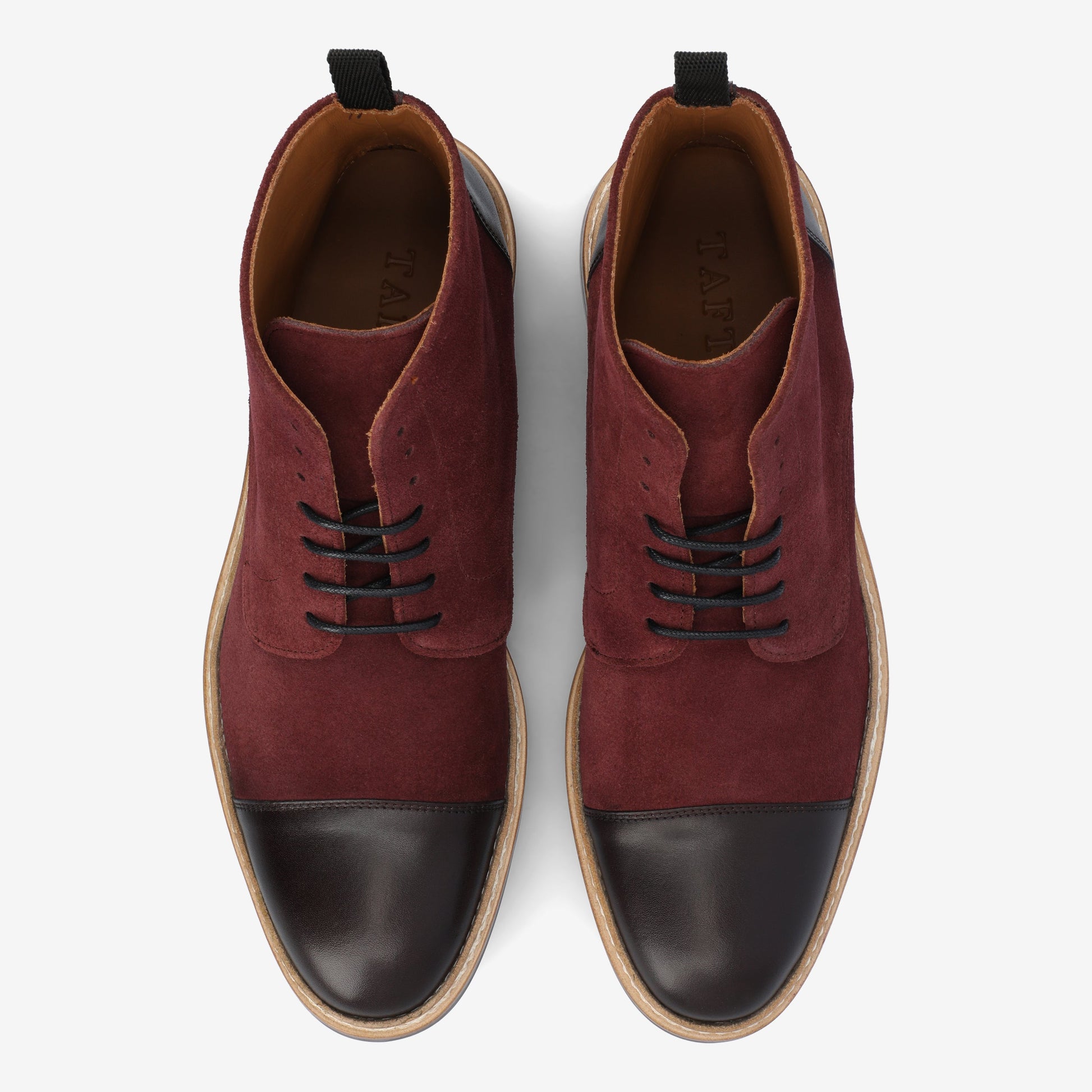 Presenting the Troy Boot in Oxblood, a TAFT signature piece. This boot, masterfully crafted from Spanish suede in a rich Oxblood hue, is accentuated with a full-grain calfskin toe cap and heel counter, blending luxury with durability. Its custom TAFT "Shoe Dog" rubber sole, braided welt, and resoleable Blake Construction ensure both comfort and longevity. Ideal for a variety of occasions, this boot epitomizes TAFT's fusion of style and craftsmanship – an admirable choice for those who appreciate sophisticated footwear.